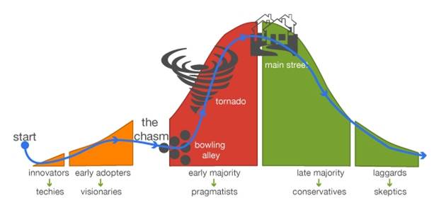 Geoffrey Moore put this forward in Crossing the Chasm and Inside the Tornado. What many of us do when we describe market adoption is we put ourselves, the vendor, on that chart. It doesn’t matter where you are. What matters is where your market is. We need to identify where the market is and therefore, what they’re ready for and that changes over time. The right strategy when the market’s new is very different from the right strategy when the market is more established, regardless of where you are in your journey as the seller. It’s more about your buyer and where they are in their journey.