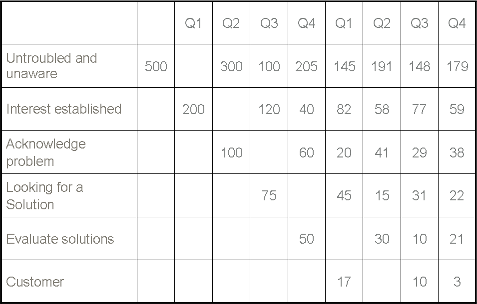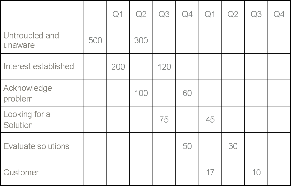 Build a simple model (below) that shows how buyers progress through each stage in their journey, recognising that you will always lose some, and it takes time for those you don’t lose to progress through each stage.