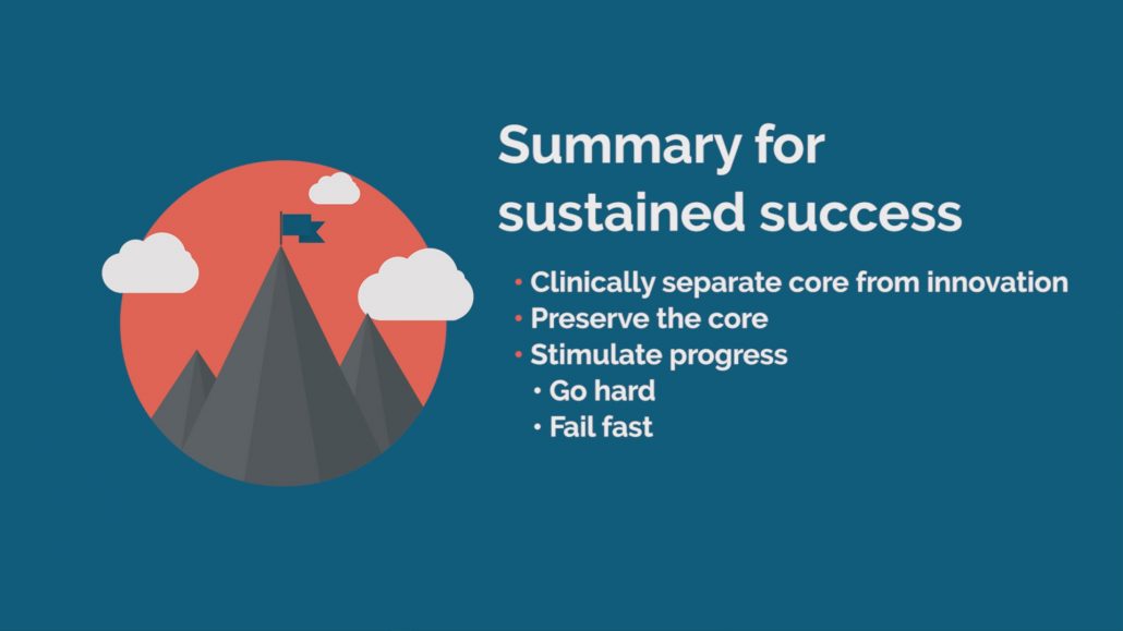 So, sustained success comes down to an essentially-simple idea – clinically separating the core of your business from that part which most deserves innovation. You preserve the core, but then you stimulate progress within innovation. Go hard and fail fast.