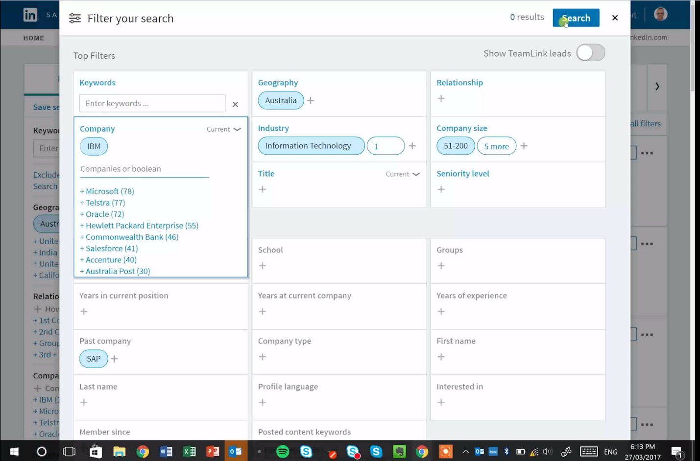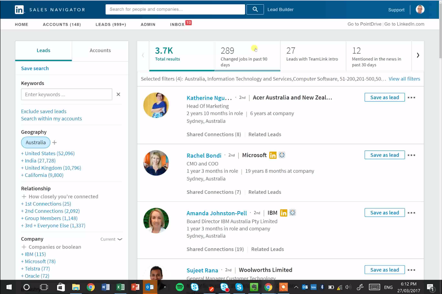 If I want to find leads through LinkedIn, I can use Lead Builder inside Sales Navigator, and, look for those businesses who are my ideal clients. As an example, in the above image I’m choosing people from Australia with a Marketing role who work in the Computer Software industry and Information Technology services. I don’t want the tiny companies, but I’m willing to deal with quite small businesses.