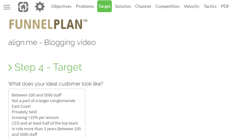 Well, the target market is only a part of your strategy, and whilst leads through LinkedIn might be a great name acquisition tactic, it’s only a part of the tactics. You need Sales and Marketing to come together and agree on all of the strategy and all of the tactics to get aligned. To do that, the best tool that I know is Funnel Plan.
