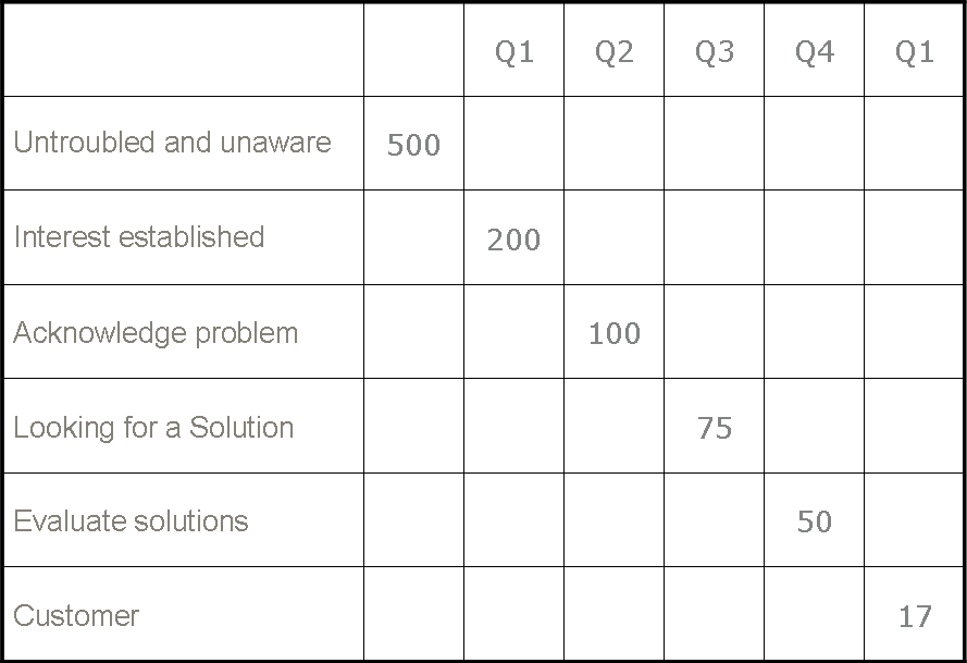 In the table above you can see that buyers took one quarter to make each progression, and that 300 buyers failed on the first attempted progression, 100 on our second, 25 on our third and fourth, and 33 on our fifth progression.