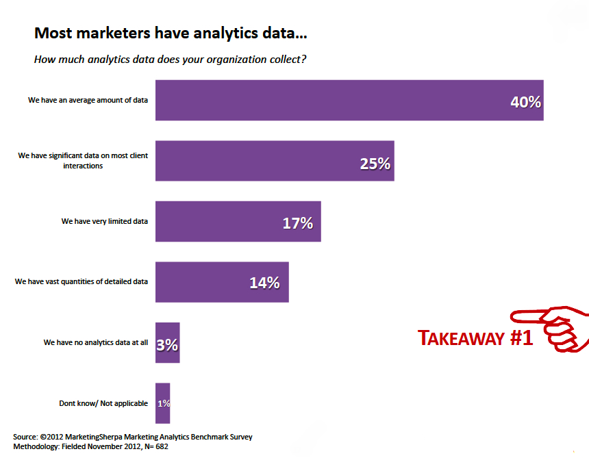 of marketers have some form of marketing analytics. In fact, almost 40% claim to have vast or significant quantities of marketing data, according to MarketingSherpa in their publication, The 2013 Marketing Analytics Benchmarking Report.