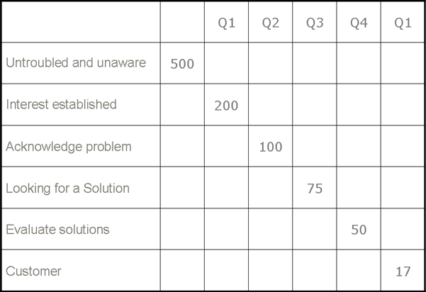 In the table above, you can see that buyers took one quarter to make each progression and that 300 buyers failed on the first attempted progression, 100 on our second, and so on.